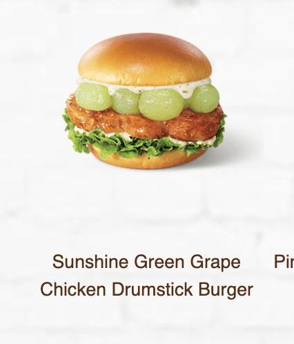 We are here for the grape burger. Which has compelled me for a few reasons. First and foremost is this: it is a limited edition item from a themed menu. This isn’t ‘oh look at this wacky foreigners putting grapes on burgers.’ What is happening here is so much funnier than that. Because, while looking at a bunch of Chinese fast food chains, I noticed a bunch of them have seasonal grape items. This must be a signature fall flavor.
